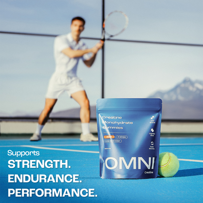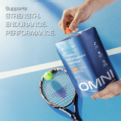 Most diets fall short on creatine. In placebo-controlled studies, 3g of daily creatine supported strength gains, recovery, and sustained focus. OMNI delivers that dose in three tasty gummies.