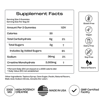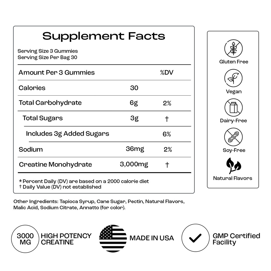 Three gummies = 3g of pure, lab-verified creatine monohydrate. Take five if you want the classic 5g dose.